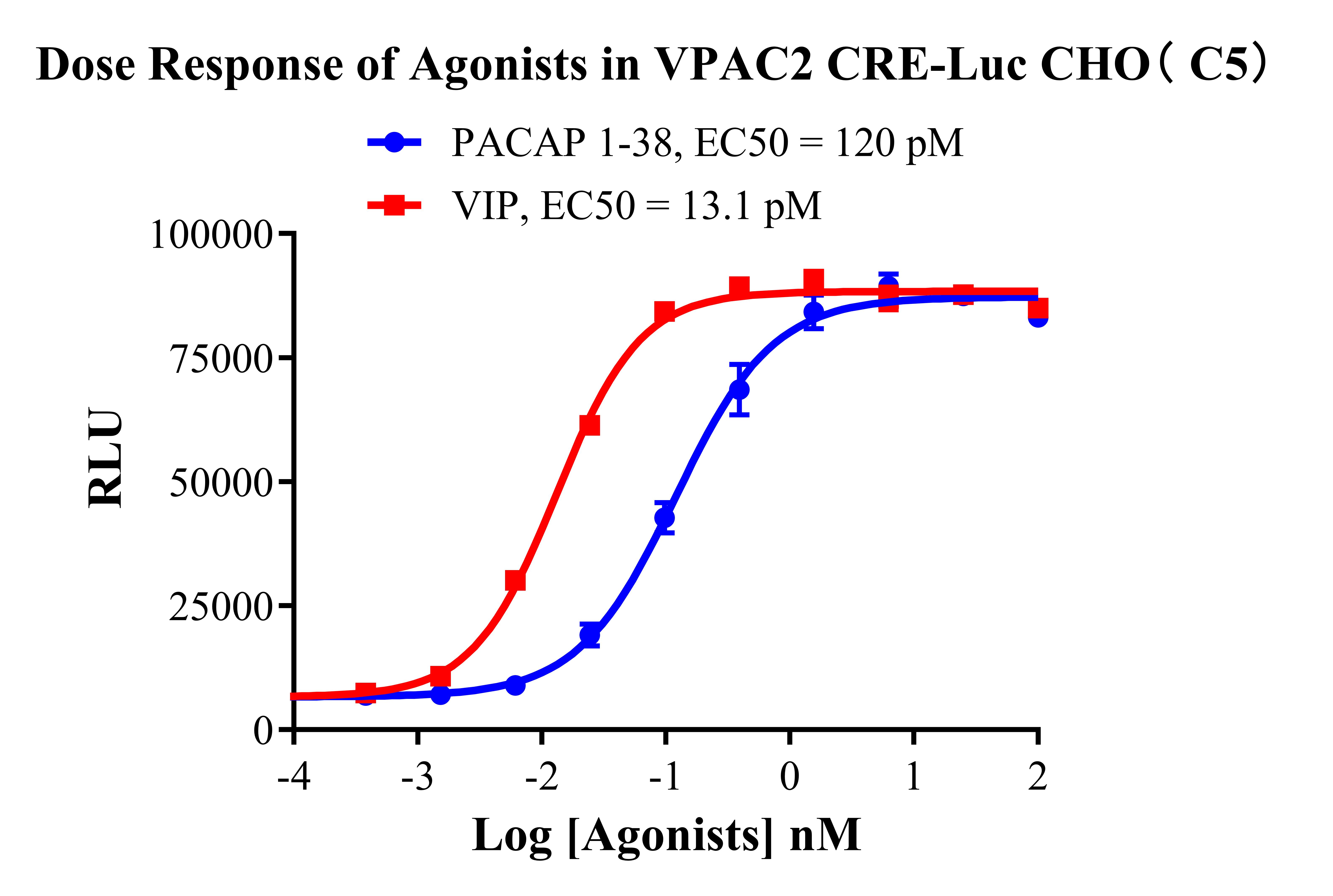 VPAC2 CRE-Luc CHO 報告基因藥靶模型很好的模擬了體內(nèi) VPAC2 的信號轉(zhuǎn)導(dǎo)過程, 原理見下圖所示。![]() Figure 1. VPAC2 CRE-Luc CHO 細(xì)胞模型原理圖 |