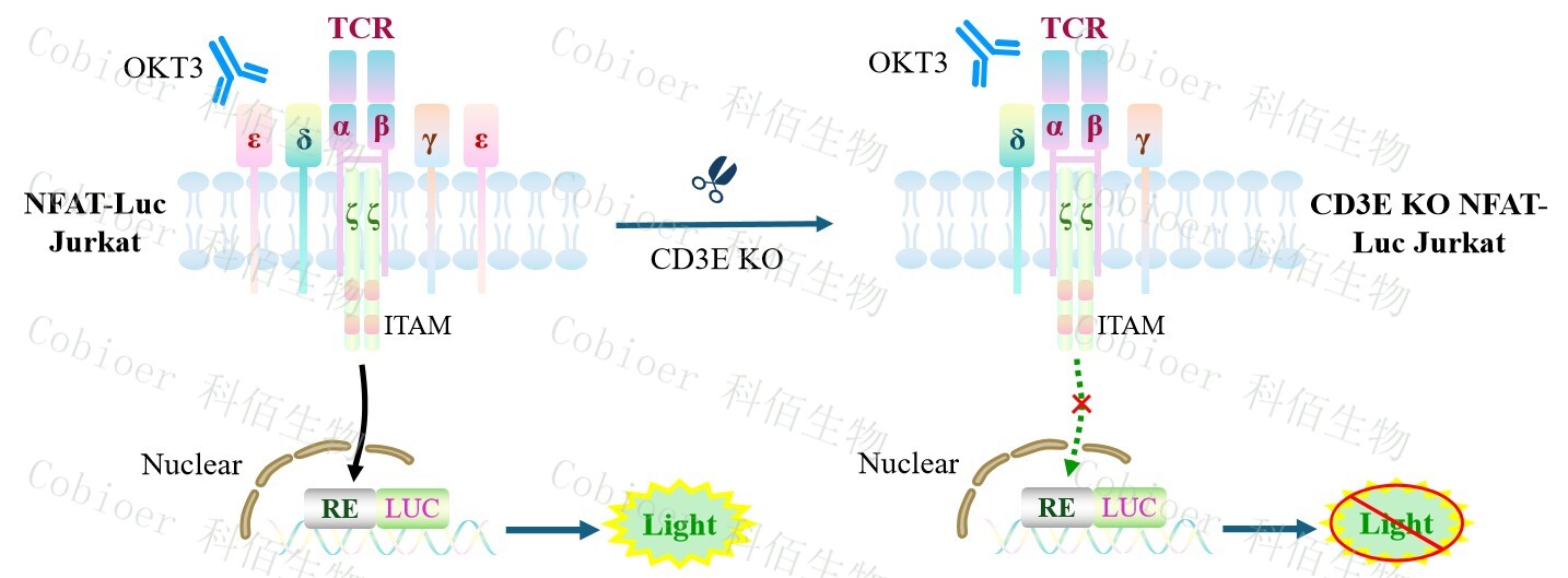 CD3E KO NFAT-Luc Jurkat 報告基因藥靶模型很好的模擬了體內(nèi) TCR 的信號轉(zhuǎn)導(dǎo)過程, 原理見下圖所示。![]() Figure 1. CD3E KO NFAT-Luc Jurkat 細胞模型原理圖 |