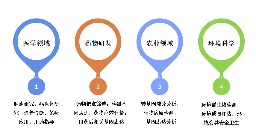 實時熒光定量PCR具有靈敏度高、特異性強(qiáng)、快速高效的特點,廣泛應(yīng)用于生物醫(yī)藥、臨床診斷、農(nóng)業(yè)、環(huán)境科學(xué)等多個領(lǐng)域,常用于檢測基因表達(dá)、基因變異、轉(zhuǎn)基因等。