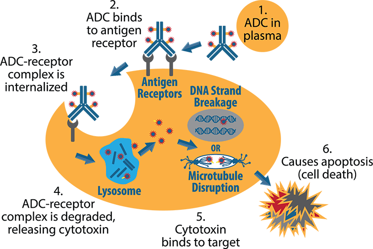 ADC藥物通過靜脈注射到血液中,隨著血液的流動,到達全身,但是科學家估計只有0.1%的ADC能到達患者的癌細胞。大部分會在循環(huán)系統(tǒng)和其他器官及組織中逐漸分解。到達癌細胞的ADC藥物一般是經歷6個過程來起作用。