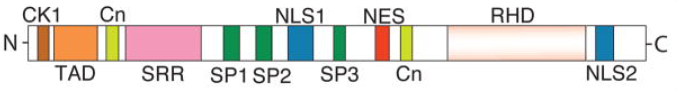 在人類中,NFAT家族由五個不同的基因產(chǎn)物組成,命名如下:NFAT1(也稱為NFATc2和NFATp);NFAT2(也稱為NFATc1和NFATc);NFAT3(也稱為NFATc4);NFAT4(也稱為NFATc3和NFATx)和NFAT5(也稱為TonEBP和OREBP)。鈣調(diào)控的經(jīng)典NFAT蛋白(NFAT 1-4)由多個功能模塊組成,這些模塊決定了蛋白質(zhì)的磷酸化、核內(nèi)定位、DNA結(jié)合以及目標基因的轉(zhuǎn)活化。N端區(qū)域包含調(diào)控結(jié)構(gòu)域,包括酪蛋白激酶1(CK1)對接位點、轉(zhuǎn)活化結(jié)構(gòu)域(TAD)和鈣煜氨酸(Cn)對接位點。C端包含DNA結(jié)合的Rel同源結(jié)構(gòu)域(RHD)和一個額外的鈣化神經(jīng)素對接位點。蛋白質(zhì)中間有幾個富含絲氨酸的結(jié)構(gòu)域(SRR、SP1-3),為靶向NFAT的激酶提供磷酸化位點。此外,NFAT蛋白包含兩個調(diào)控其亞細胞定位的信號序列:核定位信號序列(NLS1和NLS2)和核輸出信號(NES)。與經(jīng)典的NFATc蛋白不同,NFAT5(也稱為強張增強蛋白結(jié)合蛋白)不依賴鈣神經(jīng)素或核伴侶即可發(fā)揮活性。