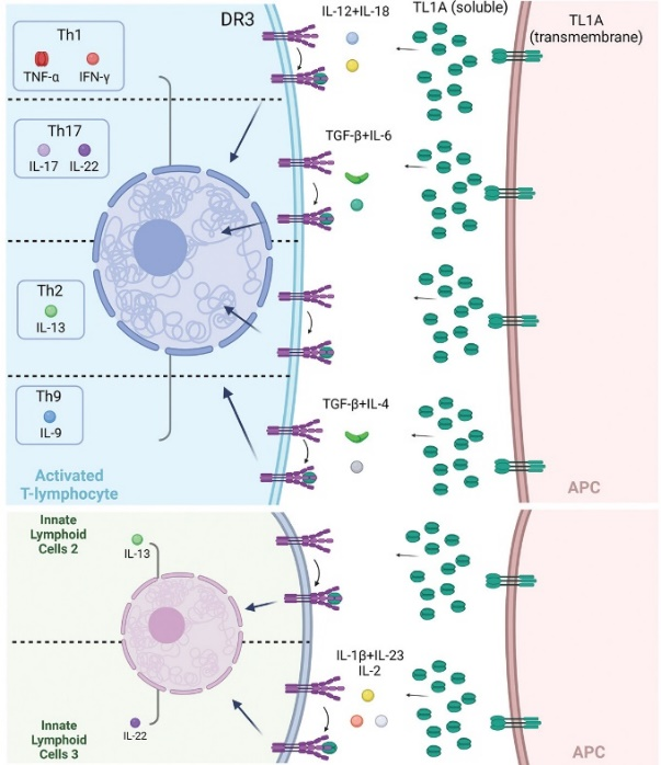 TL1A/DR3信號的下游作用包括產(chǎn)生幾種關鍵的因子,如IFN-γ、TNF-α、IL-6和IL-17,以及IL-2、IL-4、IL-13,這些促炎因子表達上調(diào),并可能產(chǎn)生致病作用。